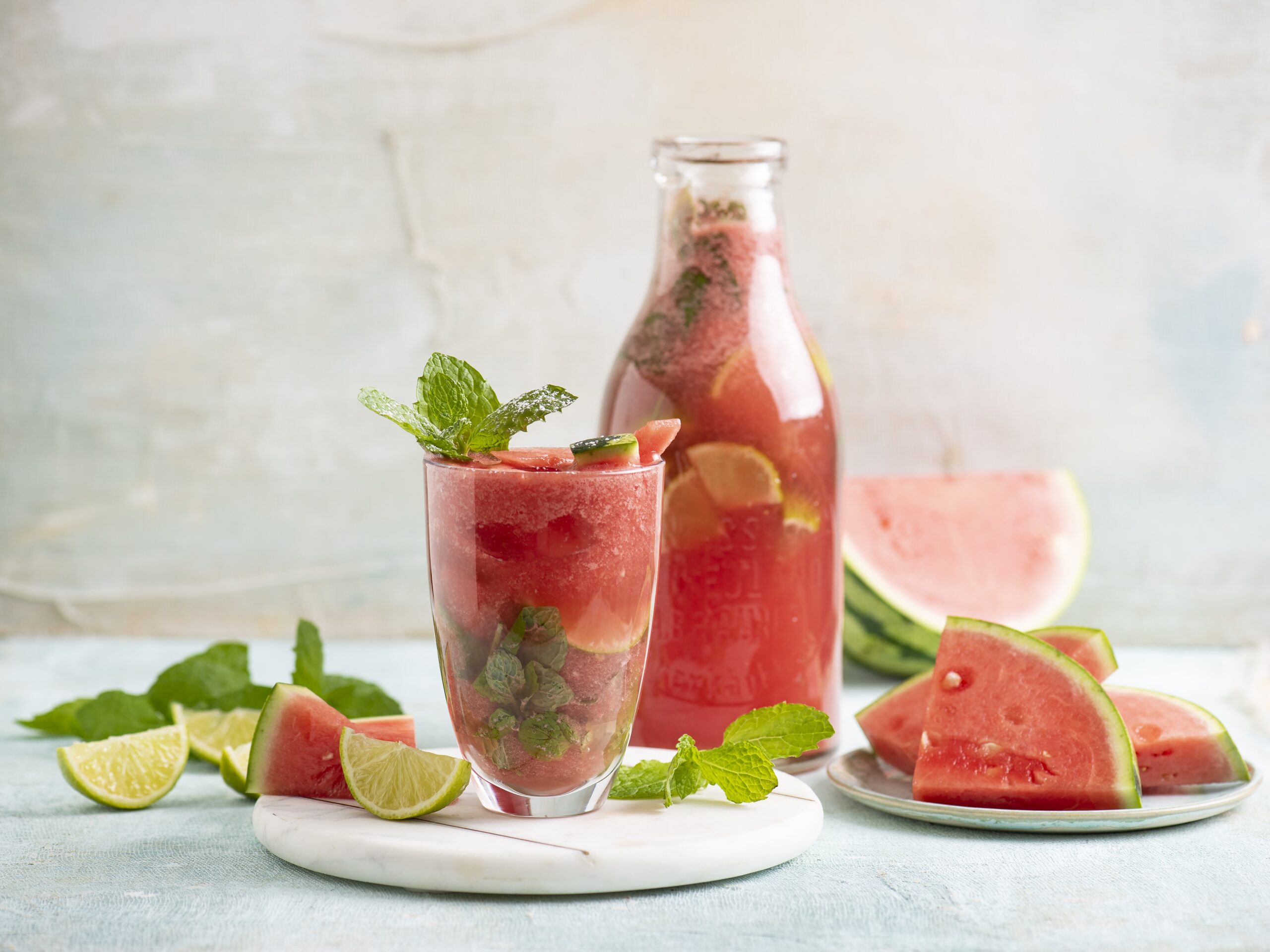 Arbuza blendujemy, dodajemy syrop, pokrojone w ćwiartki limonki, wodę i mieszamy. Dodajemy miętę. Chłodzimy w lodówce. Podajemy z kostkami lodu.