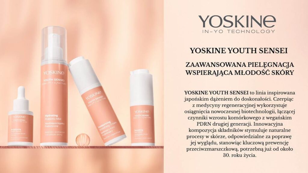 YOSKINE YOUTH SENSEI to linia inspirowana japońskim dążeniem do doskonałości. Czerpiąc z medycyny regeneracyjnej wykorzystuje osiągnięcia nowoczesnej biotechnologii, łączącej czynniki wzrostu komórkowego z wegańskim PDRN drugiej generacji. Innowacyjna kompozycja składników stymuluje naturalne procesy w skórze, odpowiedzialne za poprawę jej wyglądu i młodość skóry, stanowiąc kluczową prewencję przeciwzmarszczkową, potrzebną już od około 30. roku życia.